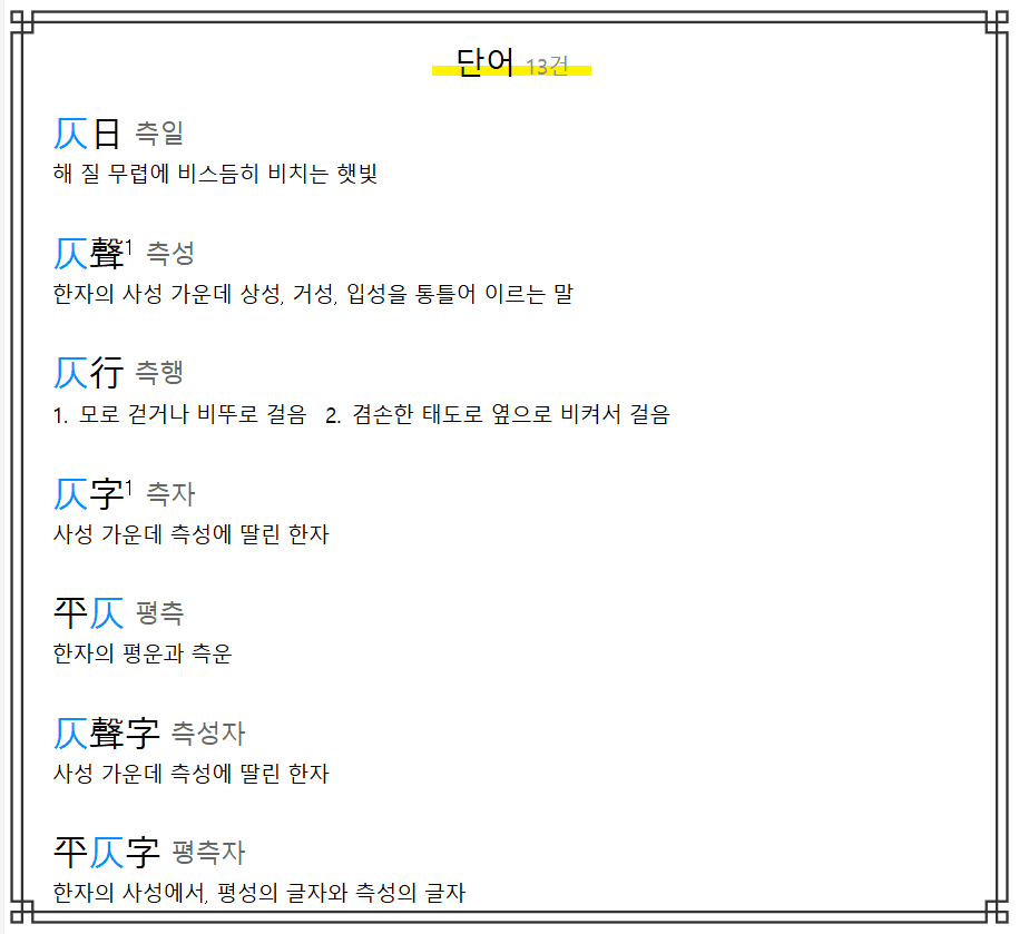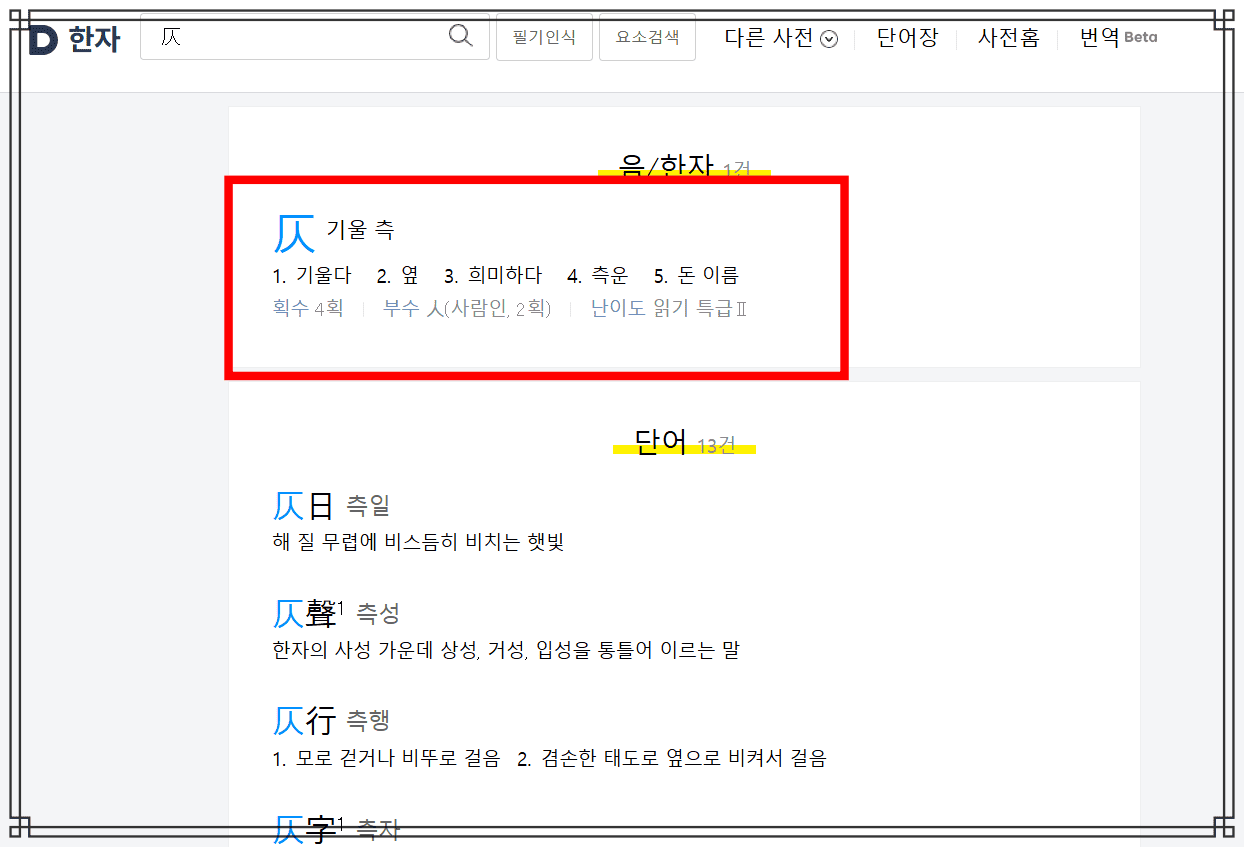 해당 한자는 기울 측이며 기울다, 희미하다 등의 뜻을 가졌고 획수는 4획, 난도는 높은 편이라는 것을 확인할 수 있습니다. 아래에서는 기울 측이 사용된 다양한 단어들을 함께 볼 수 있으니 참고하시기 바랍니다.