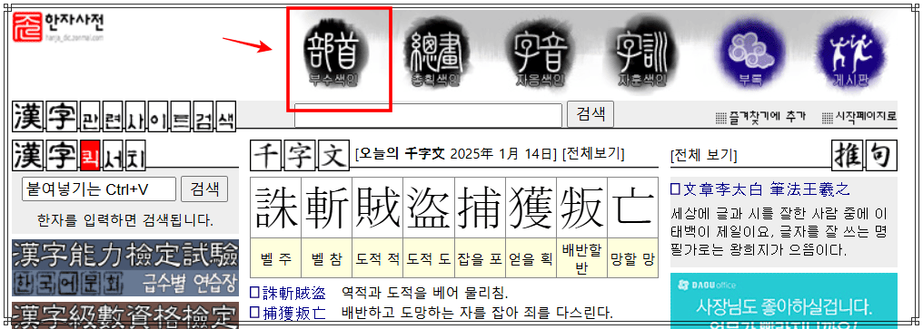 가장 대표적인 부수로 한자찾기 방법은 다음 한자 사전을 이용하는 것입니다. 아래를 통해 다음 한자 사전 페이지로 이동하시기 바랍니다.