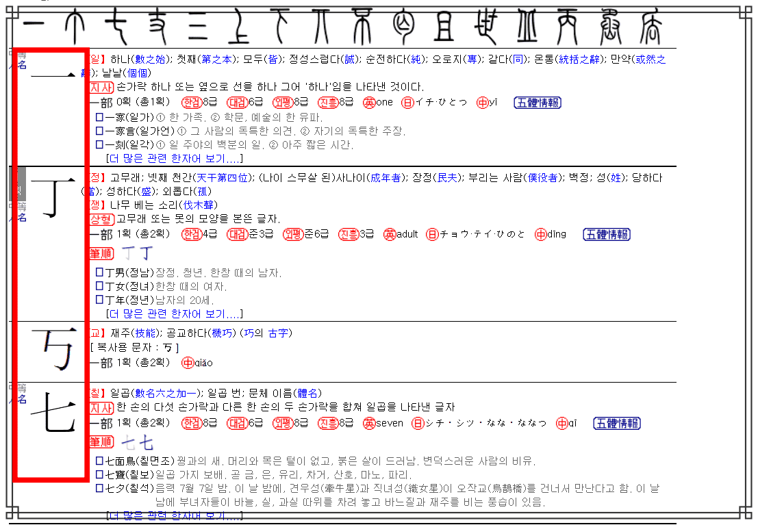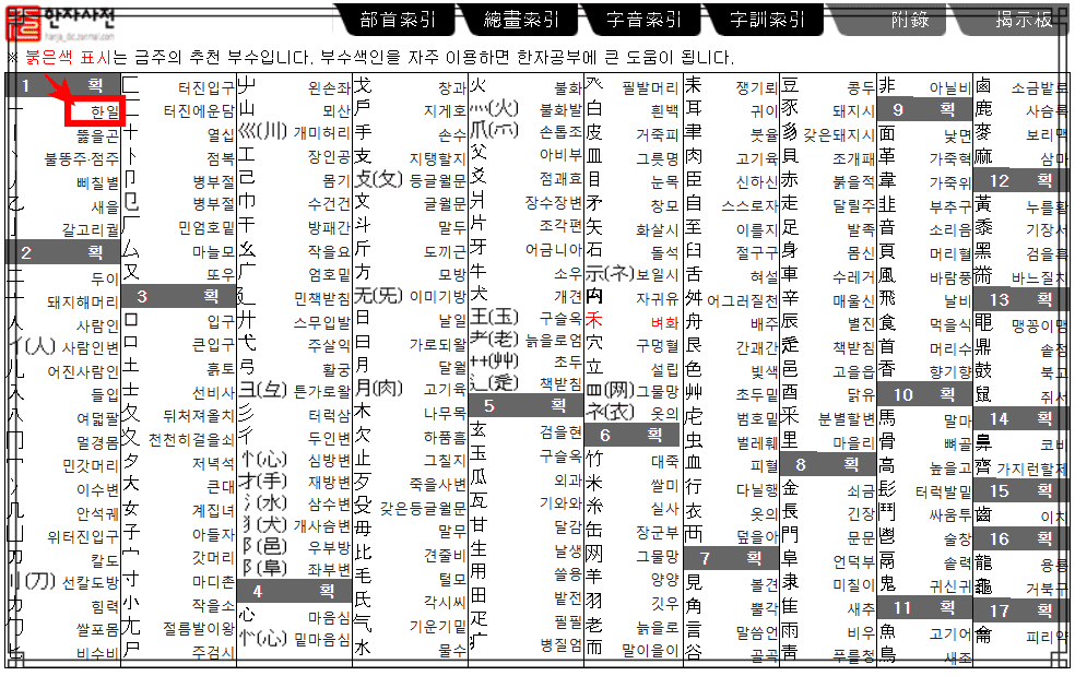 부수색인 페이지가 표시되면 원하는 부수를 마우스로 선택합니다. 이후 한일이 포함된 다양한 한자들이 검색결과로 표시되는 것을 확인할 수 있습니다.