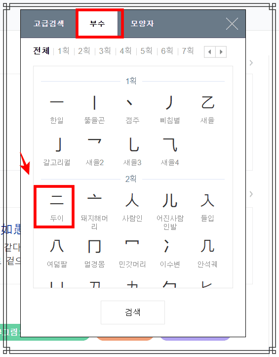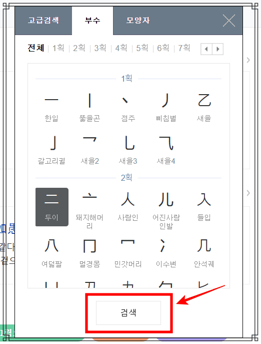 이후 고급검색 메뉴가 활성화되면 상단 메뉴에서 부수를 선택합니다. 이후 획수별로 나누어진 부수 중 원하는 부수를 선택하고 하단의 검색 버튼을 클릭합니다.