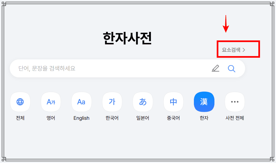 다음 한자 사전으로 이동하시면 위와 같은 첫 페이지를 확인할 수 있습니다. 검색창 우측 상단에서 [요소검색] 메뉴를 클릭합니다.
