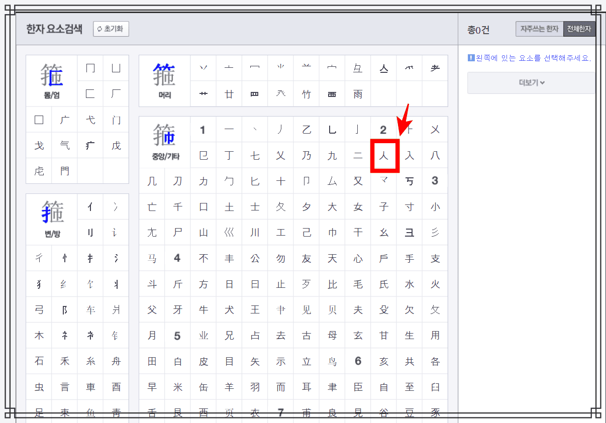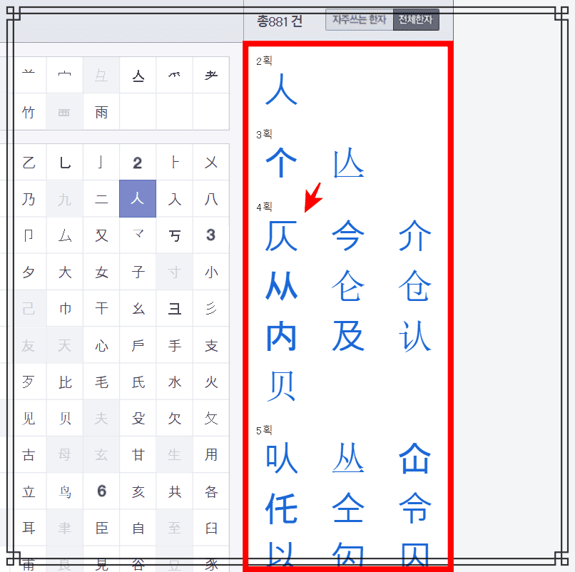 한자 요소 검색 페이지에서 찾고자 하는 한자의 부수를 선택합니다. 여기에서는 사람 인을 선택해 보았습니다. 이후 우측에서 총 881건의 사람인을 부수로 포함하는 한자들을 발견할 수 있습니다. 원하는 한자가 있다면 마우스로 클릭합니다.