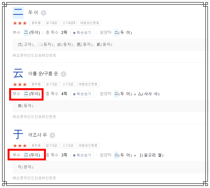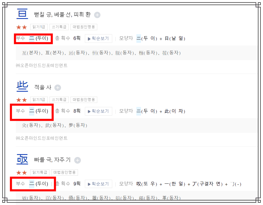 검색결과를 확인하시면 제가 선택한 두 이를 포함한 다양한 한자들을 확인할 수 있으니 부수로 한자찾기를 직접 시도해 보시기 바랍니다.